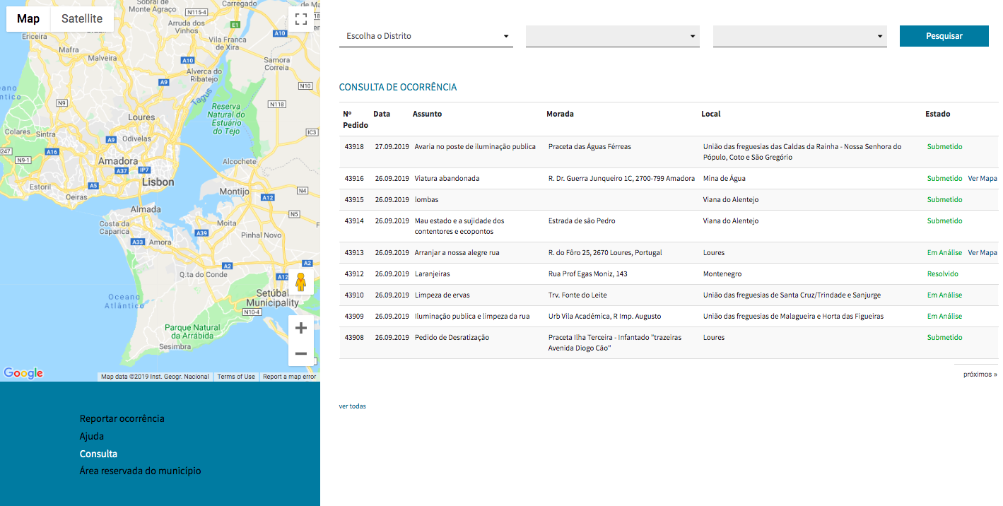 Na área de consulta é possível ver as ocorrências registadas, filtrando-as por distrito, concelho e freguesia. Apesar de visível, o mapa não assinala a local da ocorrência a não ser que se clique explicitamente no link “Ver Mapa” disponível para algumas das ocorrências.
